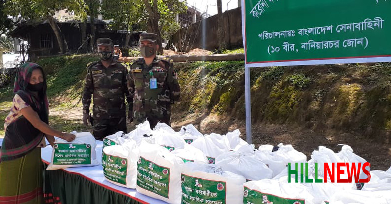 করোনা পরিস্থিতিতে চলমান লকডাউনে বাংলাদেশ সেনাবাহিনী নানিয়ারচর জোন নিজেদের জন্য বরাদ্দ খাদ্য সামগ্রী (রেশন) থেকে ক্ষতিগ্রস্থ পরিবারের পাশে দাড়িয়ে নজীরবিহীন দৃষ্টান্ত স্থাপন করলেন। মঙ্গলবার সকার ১১টায় নানিয়ারচর মডেল সরকারী উচ্চ বিদ্যালয় প্রাঙ্গনে করোনায় ক্ষতিগ্রস্থ অসহায় ও হতদরিদ্র ৮০টি পরিবারের মাঝে ত্রাণ সামগ্রী বিতরণ করেন, নানিয়ারচর জোন (১০ বীর) কমান্ডার লেফট্যানেন্ট কর্ণেল গোলাম মাবুদ হাসান পিএসসি।