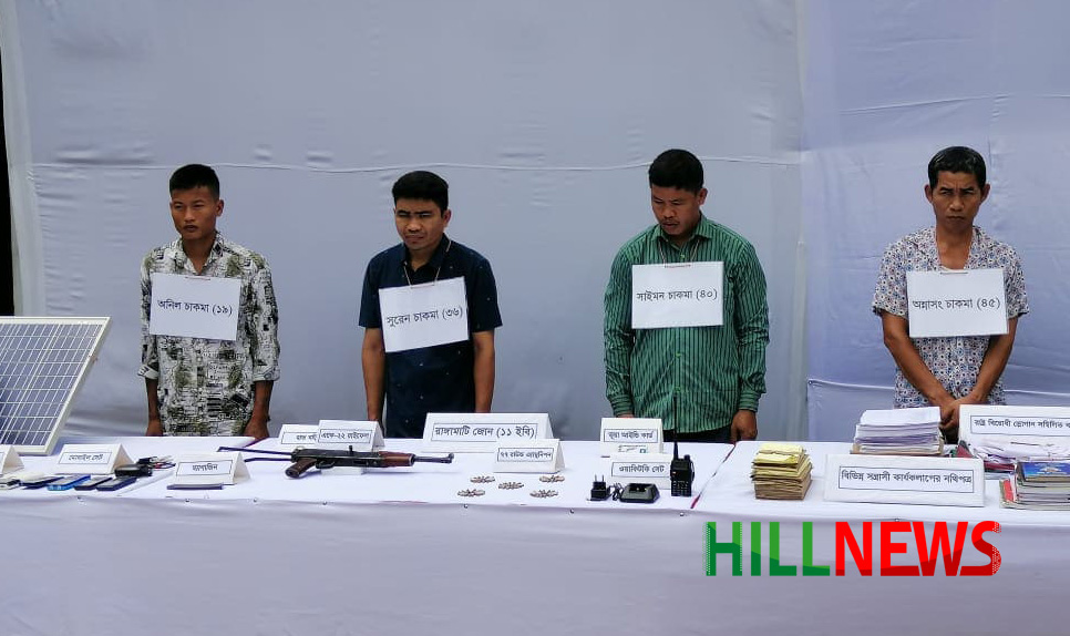 অভিযানে সুরেন চাকমা, অসিং চাকমা, অনিল চাকমা এবং সাইমন চাকমা নামের চারজনকে আটক করা হয়। এ সময় তাদের কাছ থেকে একটি একে -২২ রাইফেল , ৭৭ রাউন্ড এ্যামুনিশন , একটি ম্যাগজিন, একটি ওয়াকিটকি সেট , একটি সোলার চার্জার , চাদা সংগ্রহের রশিদ বই , ০৪ টি মোবাইল সেট , ০১ টি হাতঘড়ি , ০১ টি ভূয়া আইডি কার্ড, রাষ্ট্র বিরোধী শ্লোগান সম্বলিত ব্যানার, নগদ ৬৩,৫৯২ টাকা ও অন্যান্য সরঞ্জামাদি উদ্ধার করা হয় ।
